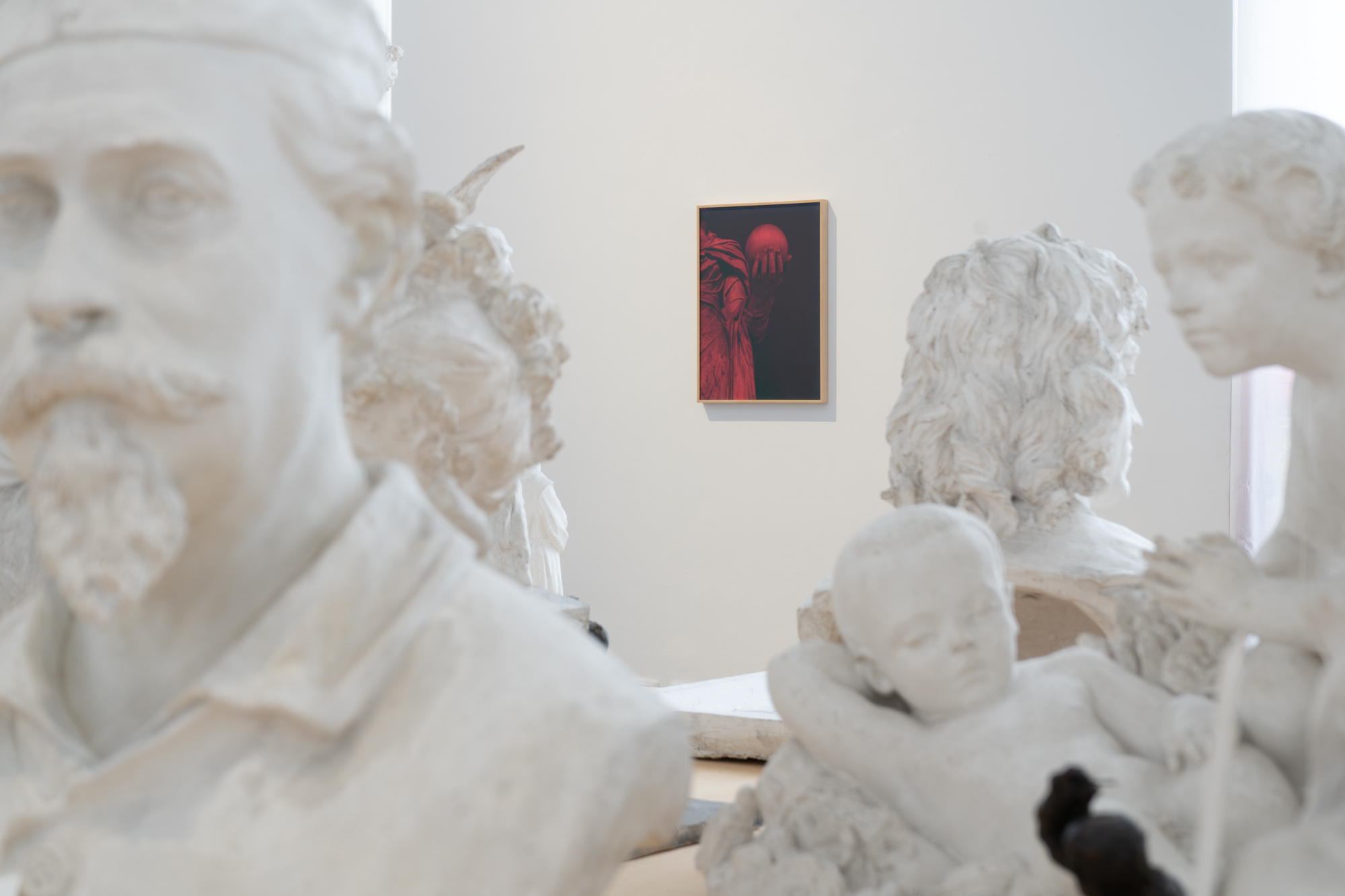 In front of the shot, placed on the table in the Museum's Plaster Room, a white plaster sculpture transforms the divine gesture into a mortal one, showing the arm of the goddess detached, fallen; upon closer observation, one can see the change in the gestural grip. The hand this time grasps, squeezes the celestial body, perhaps the Sun, takes possession of it, producing a change within the pre-established equilibrium. It is on this action that the artist places his reflection in the relationship between man and nature.